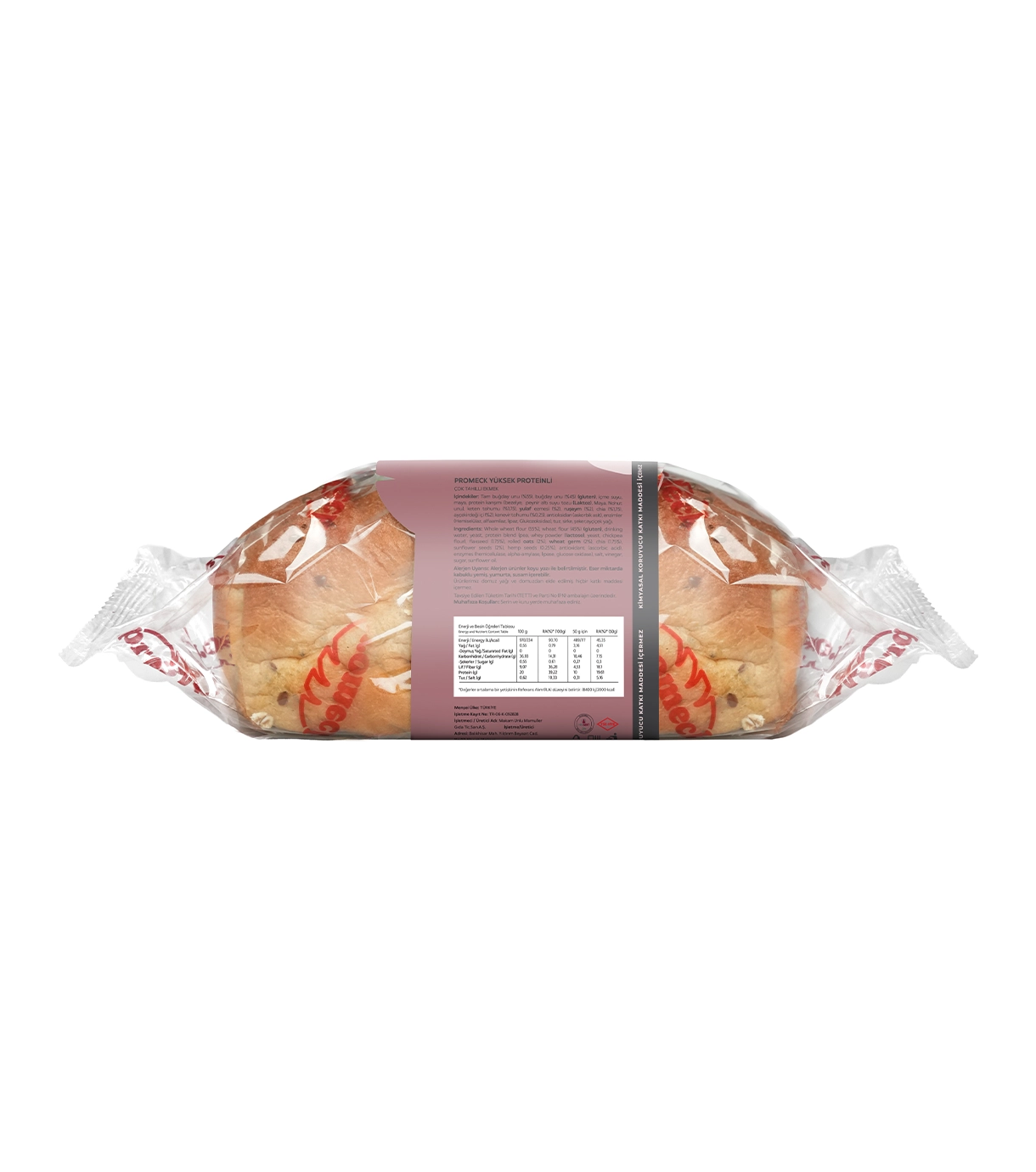 İçindekiler: Tam buğday unu (%55), buğday unu (%45) (gluten), içme suyu, maya, protein karışımı (bezelye, peynir altı suyu tozu (Laktoz), Maya, Nohut unu), keten tohumu (%1,75), yulaf ezmesi (%2), ruşeym (%2), chia (%1,75), ayçekirdeği (%2), kenevir tohumu (%0,25), antioksidan (askorbik asit), enzimler (Hemiselülaz, alfaamilaz, lipaz, Glukozoksidaz), tuz, sirke, şeker, ayçiçek yağı.